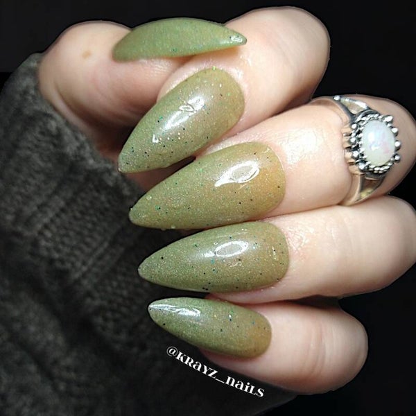 Deep plum gray that changes to pea green with fine glitter specs